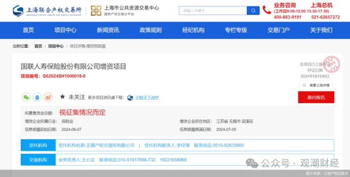 6个月后,国联东谈主寿再次开释增资需求,在上海蚁合产权往还所预透露增资名目,公开寻找投资者。