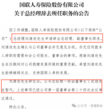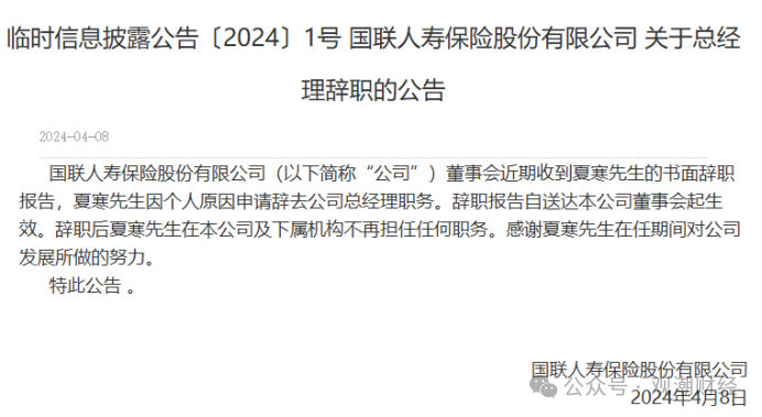 2024年4月,国联东谈主寿公司官网发布公告,夏寒因个东谈主原因肯求辞去总司理职务。同期,赵雪军出任该公司临时负责东谈主,并于2025年1月庄重任任总司理。不外,同庚10月其离任赶赴财信东谈主寿,后由钮磊磊出任国联东谈主寿临时负责东谈主。
