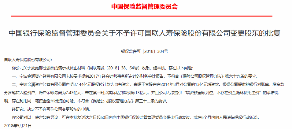 2016年6月,国联东谈主寿首次发生鼓舞变更,江苏开源钢管转让其所捏一半股份给无锡万迪能源集团。2017年5月,浙江富豪沈国军意欲通过宁波金润财富,从无锡报业发展得到12%的股权,不意因收购款项存在轮回注资问题,被原保监会否决,入主无果。
