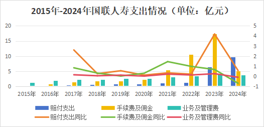 支拨端来看,国联东谈主寿手续费及佣金支拨于2023年达到岑岭,从保费收入情况来看系业务发展所致。次年起,该公司降本增效,除赔付支拨外其他两项缠绵均大幅下落。
