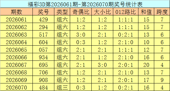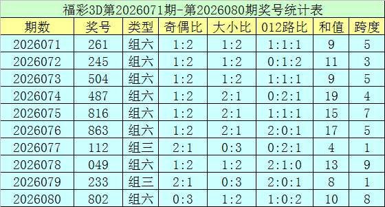 上期总结:福彩3D第2026080期开奖号码为802,组选类型为组六,奇偶比为0:3,大小比为1:2。