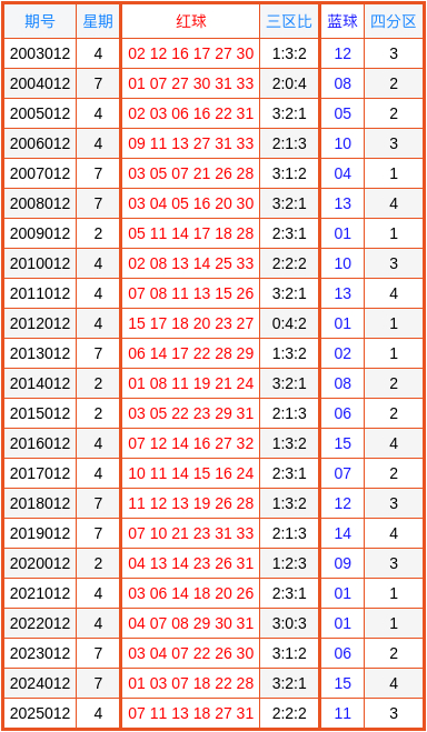三区号码【23-33】:在历年双色球第012期同期奖号中,该区开出率为32.61%,表现一般,与理论概率相近。本期预计该区出号2枚,推荐出号关注:24、31。