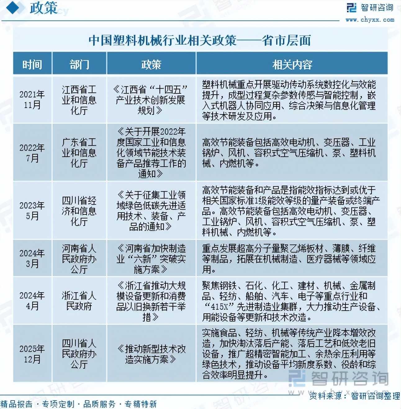 说明《“十四五”计较》,我国将抓续加大国度节能减排的力度以及分娩本事的创新力度,塑料机械行业靠近着全产业链结构的从头整合,多半省份依托对制造业全面绿色化、数字化、智能化的条目,以及产业链应用上高端塑料分娩本事水平的全面擢升的诉求,对塑料机械行业建议了相关的维持政策以及指引见解。举例,2021年11月,江西省工业和信息化厅印发《江西省“十四五”产业本事创新发展计较》,塑料机械重心开展驱动传动系统数控化与遵守擢升,成型经过复杂参数传感与智能截止,镶嵌式机器东说念主协同应用、概括决策与信息化搞定等本事研发及应用。2025年12月,四川省东说念主民政府办公厅印发《推动新式本事改换实施决策》,实施食物、轻纺、机械等传统产业降本增效改换,加速淘汰过时产能、过时工艺和低效老旧建造,彭胀超精密智能加工、余热余压哄骗等绿色本事,推动建造平均新度通盘、役龄和概括成果赫然擢升。