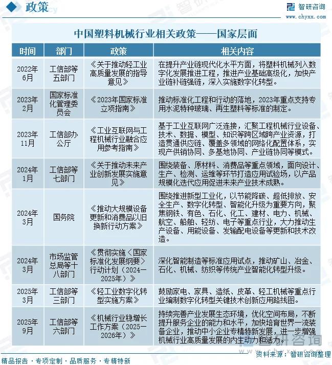 自2022年以来,国务院、发改委、工业和信息化部、生态环境部等多个部门连续印发了维持和标准塑料机械行业的发展政策,现实波及推动行业数字化转型、强化产业链协同、加速建造更新与本事改换、促进绿色低碳转型等方面。举例,2022年6月,工信部等五部门印发《对于推动轻工业高质料发展的指引见解》,在擢升产业链当代化水日常面,将塑料机械列入数字化发展推动工程,推动产业基础高档化,加速产业链补链强链,久了实施数字化转型。2025年3月,工信部等三部门印发《轻工业数字化转型实施决策》,饱读动家电、居品、造纸、皮革、轻工机械等重心行业编制数字化转型要害本事创新应用路子图。