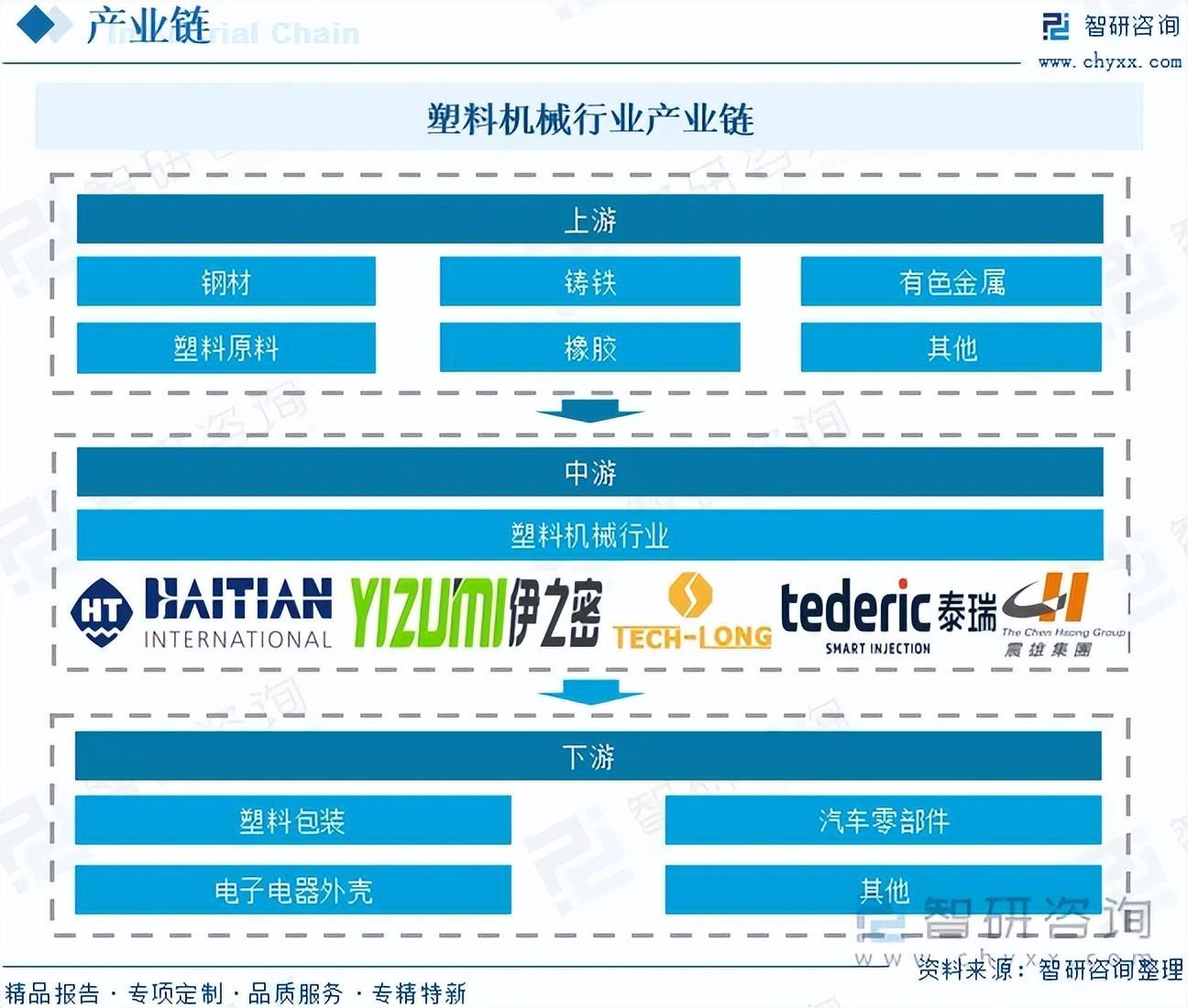从产业链来看,塑料机械产业链上游为金属材料及高分子材料供应,包括钢材、铸铁、有色金属、塑料原料、橡胶等。产业链中游为塑料机械的分娩制造商,分娩出各类塑料机械产品,如注塑机、挤出机、吹塑机等。产业链卑鄙为塑料成品制造商,他们使用塑料机械来分娩各类塑料成品,包括塑料包装、汽车零部件、电子电器外壳等。