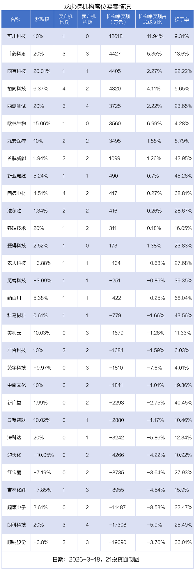 3月18日,30只个股龙虎榜出现了机构的身影,机构统统净卖出4.74亿元。具体来看,机构净买入13股,凯狮优配净卖出17股。