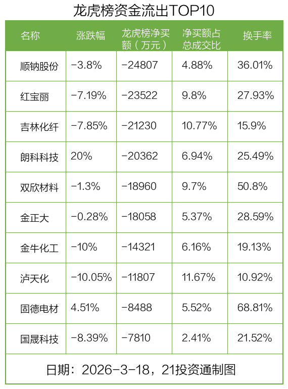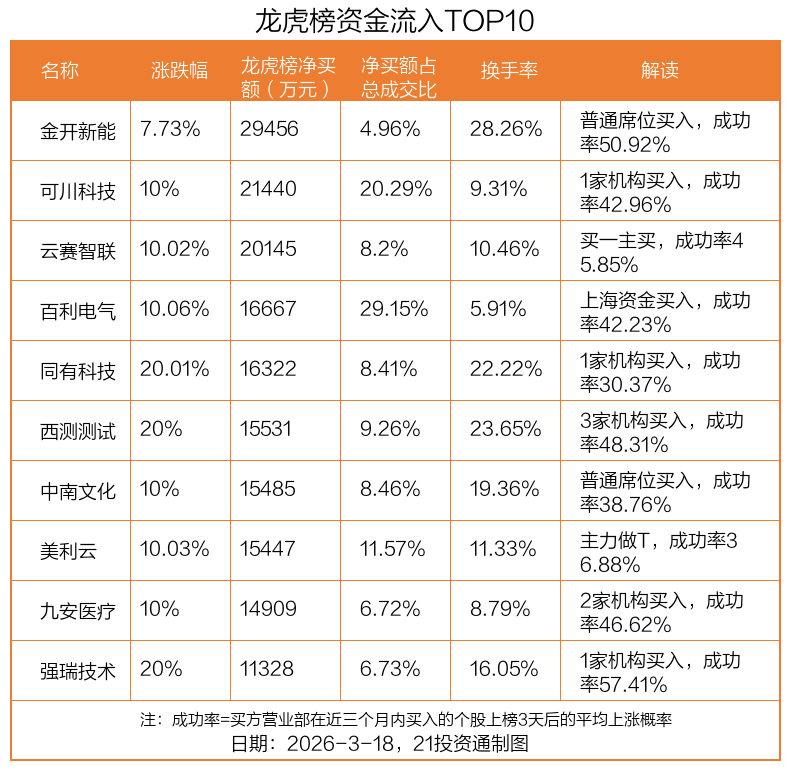3月18日,上证指数高潮0.32%,深证成指高潮1.05%,创业板指高潮2.02%。盘后龙虎榜数据露馅,共有51只个股因当日异动登上龙虎榜,资金净流入最多的是金开新能(600821.SH),达2.95亿元。