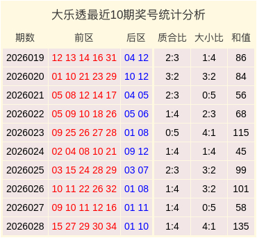 大乐透2026028期开奖,本期奖号:前区15、27、29、30、34,后区01、10。其中前区奖号质合比为1:4,大小比为4:1,和值为135。