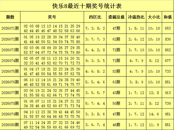 福彩欢快8第2026080期开奖回顾:07 11 14 24 25 27 32 33 34 46 49 52 54 56 59 60 61 66 69 72,其中奖号四区比为3:6:7:4,遗漏总值为46,大小比为11:9,012路比为8:7:5,和值为851。