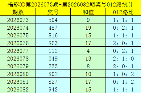 个位分析:该位最近10期开出了4个0路号码、3个1路号码、3个2路号码,0路号码热出。本期摒除2路号码,参考号码:9。