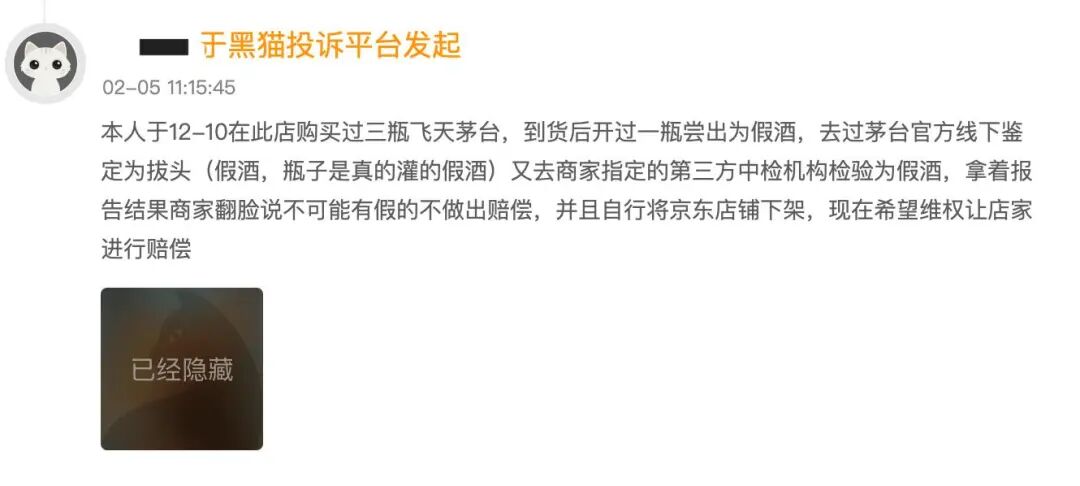 黑猫投诉 【下载黑猫投诉客户端】平台上此类案例层见叠出。有花消者投诉称,其在品牌方线下阻塞机构阻塞所购酒为拔头酒,又在商家指定的第三方检会机构赢得假酒阻塞证明,但商家拒不承认,并关闭了电商平台店铺。