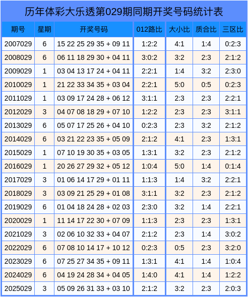 大小比推选:在积年同时开奖中,前区大小比为53:42,大数弘扬稍热;最近5年同时前区大小比为13:12,昨年同时前区大小比为3:2,本期看好大数弘扬稍热,臆测大小比为3:2。